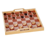 comes with set of color-coordinated wood checkers and handy bag to attach to the handle for easy carry.