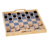 comes with set of color-coordinated wood checkers and handy bag to attach to the handle for easy carry.